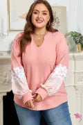 PINK FLORAL SLEEVE PATCHWORK WAFFLE KNIT NOTCHED V NECK PLUS TOP